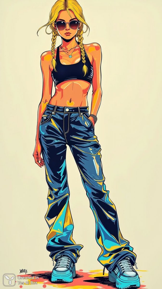 illustration, ink drawing, fashion model, neon colors posing in black bikini top, high-waisted reflective pants, shiny material, long bright yellow hair styled in two braids, edgy look and chunky sole.