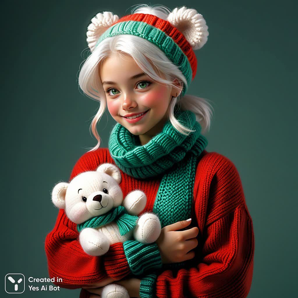 Нежная иллюстрация, пропитанная уютом и теплом, запечатлевает момент безмятежности. На черном фоне выделяется фигура юной девушки на роликах, слегка склонившей голову в приветливой улыбке. Ее белоснежные волосы собраны в растрепанные пучки, добавляя образу воздушности и наивности. Девушка одета в объемный вязаный свитер с рукавами цвета молодой зелени, дополненный теплым шарфом и яркими красными брюками – сочетание создает ощущение комфорта и защищенности. В ее руках – мягкая игрушка, светлый медвежонок в уютной вязаной шапочке, символ детства и беззаботности. Мягкий рассеянный свет подчеркивает пастельную цветовую гамму иллюстрации, создавая атмосферу спокойствия и умиротворения. Картина излучает тепло и доброту, словно приглашая зрителя окунуться в мир мечтаний и детских радостей. Это визуальная ода простоте и искренности, где каждый элемент гармонично сочетается с общим настроением произведения, передавая ощущение домашнего тепла и душевного комфорта. Иллюстрация завораживает своей нежностью и вызывает чувство ностальгии по беззаботным дням детства, напоминая о важности простых радостей в жизни. Она словно шепчет о необходимости остановиться и насладиться моментом, окружив себя теплом близких людей и любимыми вещами