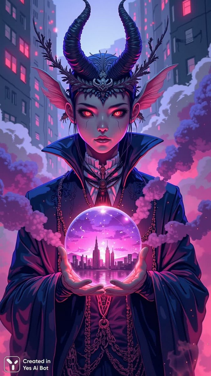 Завораживающий снимок модной фотосессии, сотканный из хаоса и притягательной красоты. В центре композиции – образ соблазнительного демона с безупречными чертами лица, чья кожа излучает внутренний свет, словно подсвеченная нездешней энергией. Яркое сияние неоновых огней переплетается с клубами густого фиолетового тумана, создавая вокруг него атмосферу таинственности и мистической приподнятости. В его руках покоится хрустальный шар, в глубине которого отражается мрачный пейзаж древнего города, словно портал в иной мир, полный печали и забытых историй. На плечах демона элегантно ниспадают лавровые венки – символ власти и бессмертия, контрастирующий с его потусторонней сущностью. Эффект длинной выдержки придает снимку особую магическую неоднозначность, размывая границы реальности и погружая зрителя в мир грез и фантазий. Каждая деталь, от мерцающих огней до призрачных теней, работает на создание неповторимого визуального опыта, заставляя задуматься о природе красоты, власти и тьмы, переплетенных воедино в этом завораживающем образе. Фотография – это не просто изображение, а портал в мир, где реальность и вымысел сливаются воедино, пленяя своей загадочностью и притягательностью. Это визуальная поэма о соблазне, силе и вечной красоте, запечатленная в мгновении времени