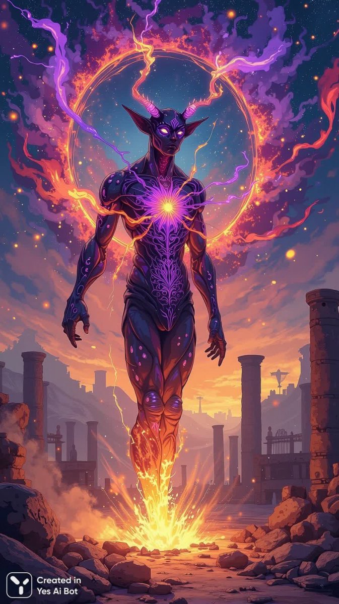 Загадочный снимок, сотканный из полутона и тайны, представляет собой завораживающую сцену с неземным существом. В центре композиции – фигура, напоминающая инкуба, окутанная клубами пламени, словно вырывающимися прямо из его груди. Лицо персонажа украшено причудливыми пурпурными узорами, создавая впечатление потусторонней красоты и древней магии. Вокруг него танцуют искры, мерцающие подобно далеким звездам, добавляя изображению нереальности и мистического очарования. Весь образ заключен в кольцо бури – символ мощи и хаоса, подчеркивающий драматизм момента. На заднем плане едва различимы руины древних построек, словно прозрачные призраки прошлого, свидетельствующие о вечности времени и таинственной истории этих мест. Мягкая фокусировка и легкая зернистость создают атмосферу загадочности и напряжения, погружая зрителя в мир фантазий и неизведанных сил. Это не просто фотография – это портал в параллельную реальность, где переплетаются красота и опасность, свет и тьма, мистика и реальность. Картина вызывает ощущение предчувствия и тревоги, заставляя задуматься о скрытых силах и тайнах мироздания. Она словно шепчет историю о древних ритуалах и забытых богах, оставляя зрителя в состоянии легкого благоговейного ужаса и восхищения перед неземной красотой. В этой работе мастерски сочетаются элементы фэнтези, мифологии и визуального искусства, создавая неповторимый образ, способный заворожить любого ценителя прекрасного и загадочного