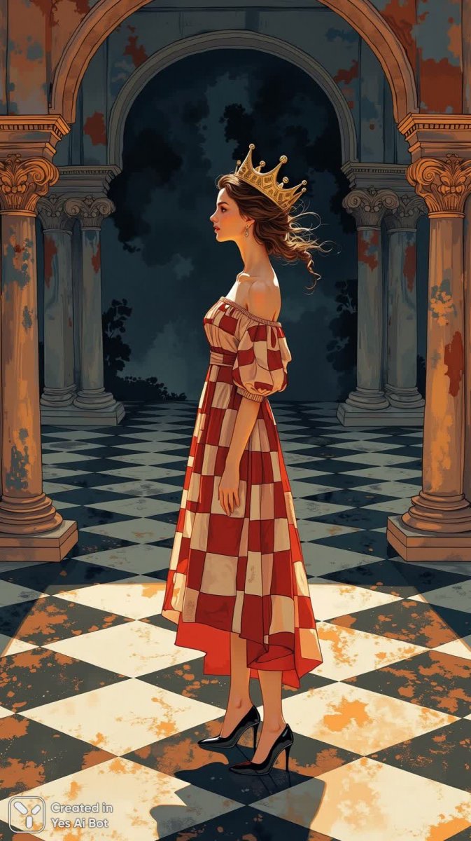 woman standing in front of large chessboard wearing checkered dress off-the-shoulder sleeves high-low hemline hair styled loose waves black high heels crown on her head looking off to side bg is dark ornate archway intricate details mood regal luxurious – sony a7iii, 24mm lens, f/1.8, cinestill 800t, cinematic lighting, shallow depth of field, 1/50s, bloom effect.
