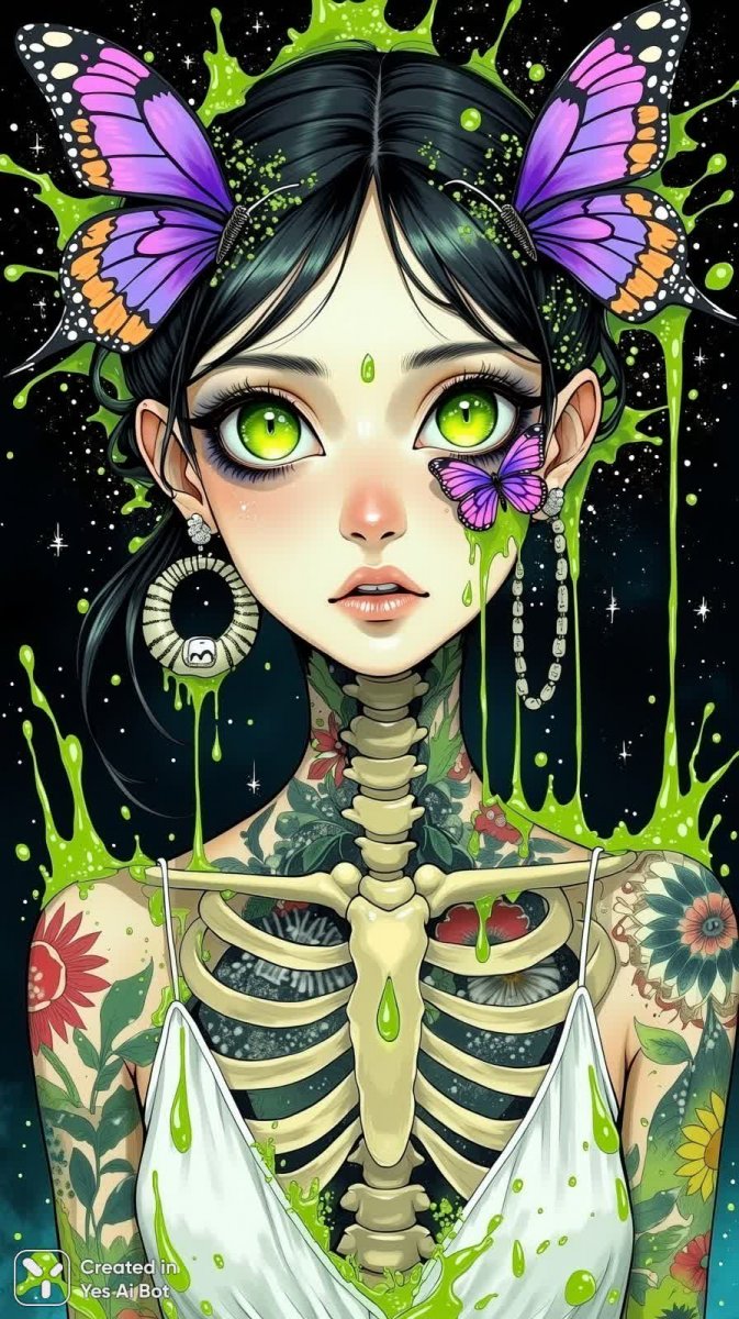 a girl with surreal makeup and intricate tattoos wears a white strap top, her eyes shine with striking neon green irises against the dark background, dripping down and enhancing the magical atmosphere, splashes and sparkles complete her look, vibrant purple butterfly rests on her cheek, skeleton earrings, liquid green substance connects, adds whimsy.