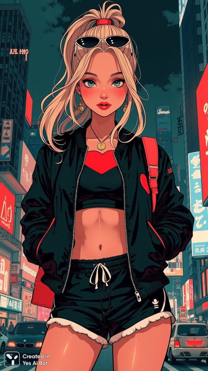 a professional photo cool girl, fit, sporty look, black bomber jacket and stylish shorts, high ponytail on her head, scarlet lipstick, bright scarlet heart on the top against a darkened cityscape background, soft red light reflections.