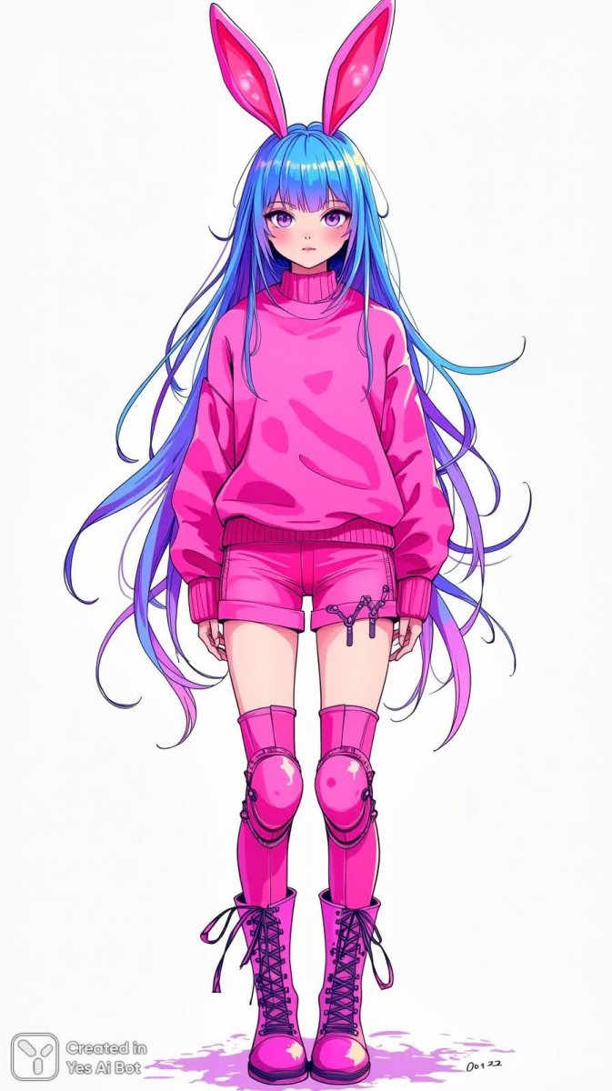 ink drawing, illustration a digital artwork depicts a young woman with long neon ultraviolet hair styled like bunny ears. she wears a neon pink sweater, shorts, knee pads, and knee-high boots.