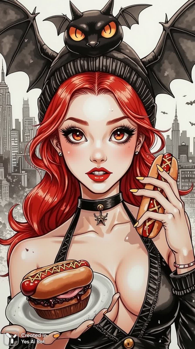 a professional photo red-haired vampire woman, black choker, spectacular hairstyle and makeup, scarlet lips, a hot dog in hand, monochrome cityscape, bean hat with pointed ears and demonic cupcake with bat wings.