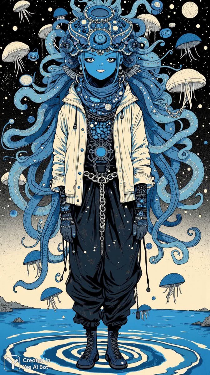 Загадочная иллюстрация в технике ризографии, изображающая девушку, парящую в сюрреалистичном пространстве. Её образ сочетает в себе элементы земного и внеземного, создавая завораживающий эффект. Девушка облачена в длинный жакет и брюки, а вокруг неё плавают медузы, добавляя сцене таинственности и легкости. Голова украшена сложной конструкцией, вдохновленной работами Кацуи Тэрады, с элементами космоса и замысловатыми деталями. Кожа девушки имеет необычный голубой оттенок, а её черты лица обладают инопланетными особенностями. Особое внимание привлекает изысканное платье, выполненное из кожи осьминога в виде цепной брони – уникальное сочетание текстур и материалов. Фон выполнен в стиле нео-нуар с использованием чёрно-белого градиента и резким контрастом, что подчеркивает яркость энергии персонажа. Иллюстрация выполнена в технике плоского 2D векторного рисунка с простыми формами и минимальными деталями, что придает ей современный вид. Вся композиция пронизана духом лоуброу искусства, а добавление элементов 'точечного' арта в стиле гранж создает ощущение динамики и пульсации. Высокое качество исполнения и детализация делают эту работу настоящим произведением цифрового искусства, сочетающим в себе элементы фантазии, научной фантастики и современного дизайна. Это портрет девушки-странника, чья судьба переплетена с тайнами космоса и неизведанными мирами