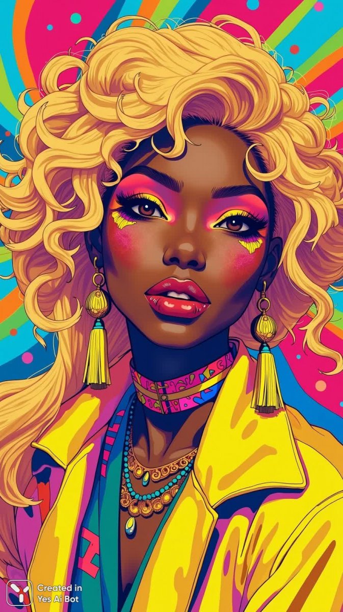 Яркий портрет современной иконы стиля. На фотографии крупным планом запечатлена эффектная афроамериканка с экстравагантной внешностью: ее пышные кудрявые волосы окрашены в неестественный барби-блонд, создавая яркий контраст с ее кожей. Образ представляет собой дерзкое сочетание высокой моды и городского уличного стиля, демонстрируя смелое видение современной красоты. В одежде используются элементы из самых разных коллекций haute couture, гармонично дополненные элементами повседневной одежды. Акцент сделан на ярких аксессуарах – длинных кисточных сережках и выразительном макияже, подчеркивающих индивидуальность модели. Задний план представляет собой динамичный психоделический вихрь неоновых цветов, создающий ощущение движения и энергии. Фотография выполнена в стиле модной editorial съемки, отличается безупречной техникой исполнения и вниманием к деталям. Это визуальное исследование смелых сочетаний текстур, форм и цветов, отражающее дух творчества и самовыражения. Яркие флуоресцентные оттенки усиливают эффект футуристичности и подчеркивают неординарность образа модели. Общий тон снимка – дерзкий, вдохновляющий и запоминающийся. Это визуальный манифест современной женственности, свободной от стереотипов и готовой к экспериментам со стилем. Фотография представляет собой настоящее произведение искусства в мире моды
