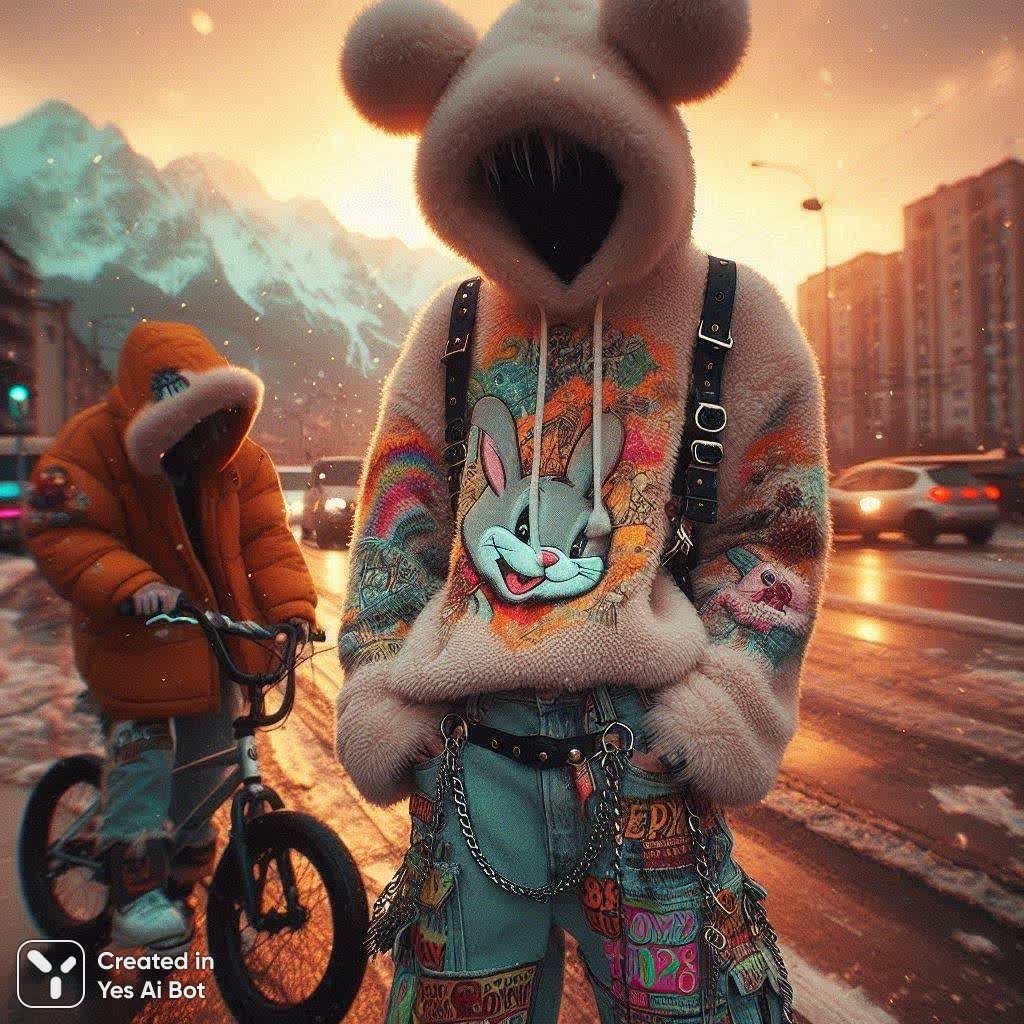 Фото на пленку, эффект старого кино, ночь не в фокусе, двойная экспозиция, сквозь иней холод, сепия с нежно бежево зеленым акцентом, прозрачные, игра теней прозрачный нежно зеленые горы, в капюшоне, пушистая Mickey Mouse стоит на фоне улица велосипед разноцветный дым, в стильных рваных широких брюках джинсы карго с разноцветными жирными неоновыми надписями принт графити, кислотно яркие пастель оттенки, узкий топ с надписями подробно принт Bunny в кожанных ремни упряжки клепки цепи, очень длинные блонд волосы, стиль одежды андеграунд гранж оверсайз, Polaroid ISO 100