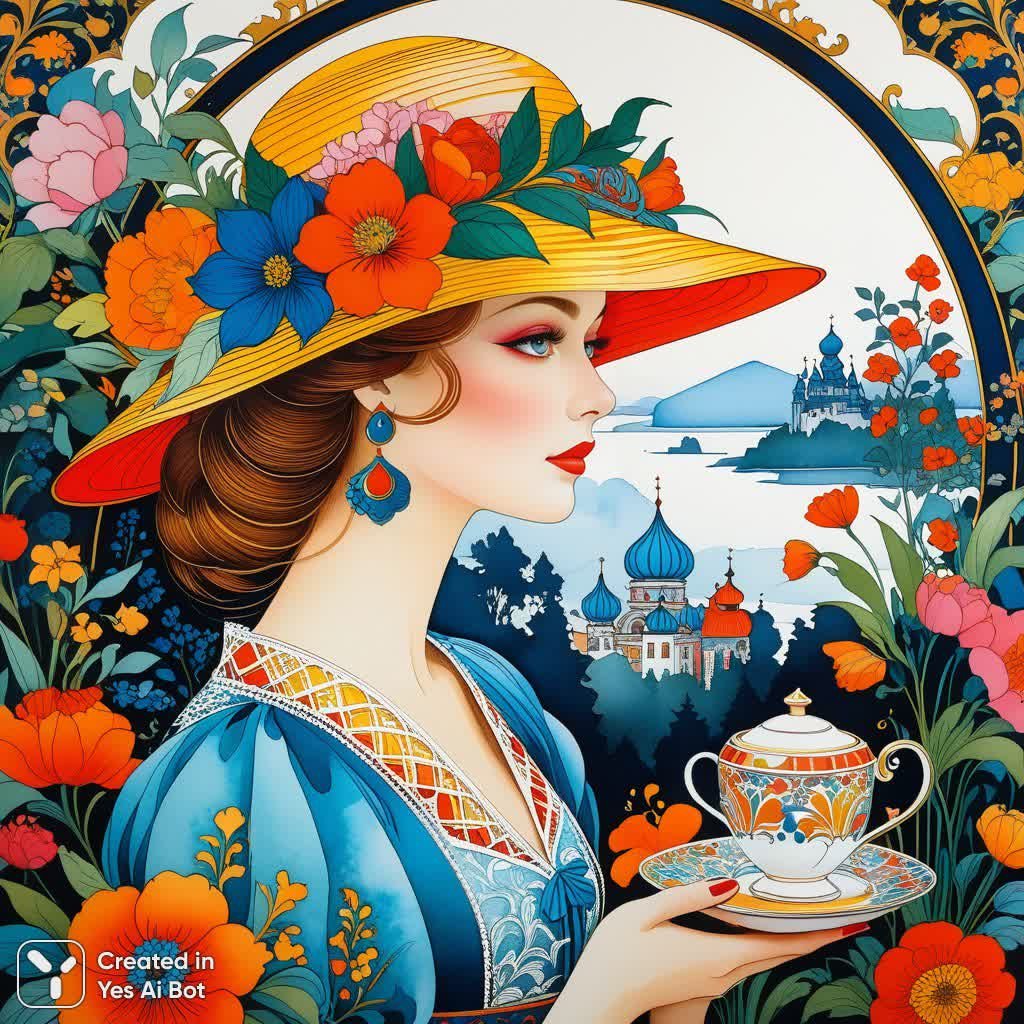 Завораживающий мир фантазий и праздника в стиле Петра Фролова и Библина – это причудливая смесь постмодернизма и иллюстративной графики, где оживают сказочные персонажи и декорации. Яркие насыщенные цвета создают атмосферу карнавала и волшебства, а густое пышное флористическое оформление поражает обилием деталей и динамикой композиции. Кажется, что в этом мире всё находится в постоянном движении, полном сюрпризов и неожиданных поворотов. Тонкие изящные линии добавляют работе невесомости и воздушности, словно кружево. Художник искусно сочетает различные техники – акрил, тушь, цветные карандаши, прозрачную акварель и холодный батик – создавая уникальную текстуру и глубину изображения. Это не просто картина, а портал в сказочный мир, где воображение не знает границ, а каждый элемент наполнен символизмом и скрытым смыслом. Взгляд задерживается на мельчайших деталях, открывая всё новые и новые грани этой удивительной работы, которая словно приглашает зрителя к чаепитию в волшебном саду. Изображение пронизано ощущением радости и беззаботности, оно дарит позитивные эмоции и переносит в мир грёз и фантазий, где возможно всё