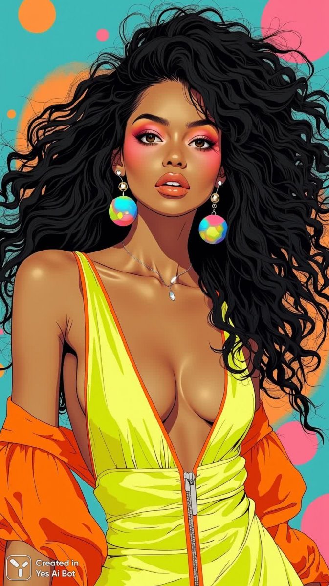 Яркий и дерзкий кадр из модной съемки переносит в атмосферу неонового диско 80-х. В центре внимания – эксцентричная модель с пышными кудрявыми волосами цвета воронова крыла, воплощающая дух эпохи. На ней ослепительное платье кислотных оттенков, идеально сочетающееся с массивными геометрическими серьгами и смелым макияжем губ. Игра света и цвета подчеркивает динамичность образа, создавая ощущение энергии и свободы. Пастельный фон с игривыми узорами добавляет легкости и воздушности композиции, контрастируя с насыщенностью цветов и графичностью деталей. Фотография излучает оптимизм и притягательность, являясь настоящим гимном индивидуальности и смелости в моде. Это визуальное воплощение бунтарского духа 80-х, переосмысленное для современной аудитории, демонстрирующее яркую палитру эмоций и неповторимый стиль. Камера запечатлела момент спонтанности и естественности, создавая ощущение живой съемки, а не постановочной фотографии. Яркие цвета, смелые формы и харизматичная модель – все это делает этот снимок запоминающимся и вдохновляющим на эксперименты с модой и самовыражением. Это визуальный праздник для глаз, наполненный позитивом и креативностью, который невозможно оставить без внимания