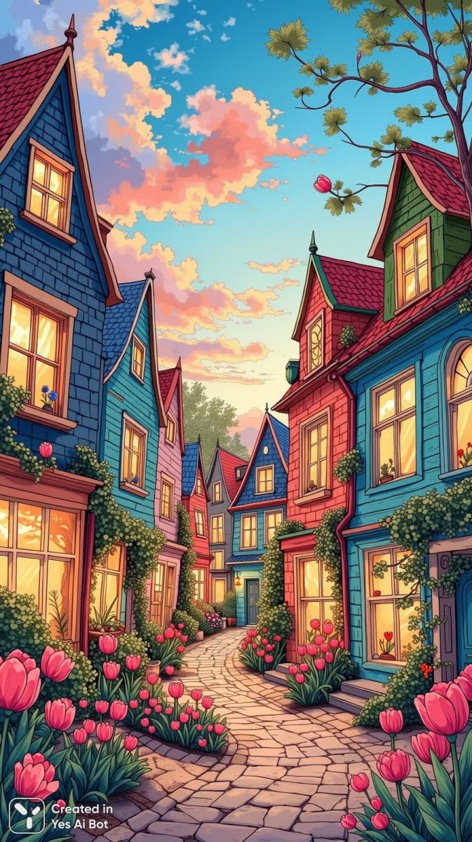 doodling, colorful fantasy street with cartoon houses, intricate details, whimsical patterns, and bright tulips dancing in the breeze under a twilight sky.