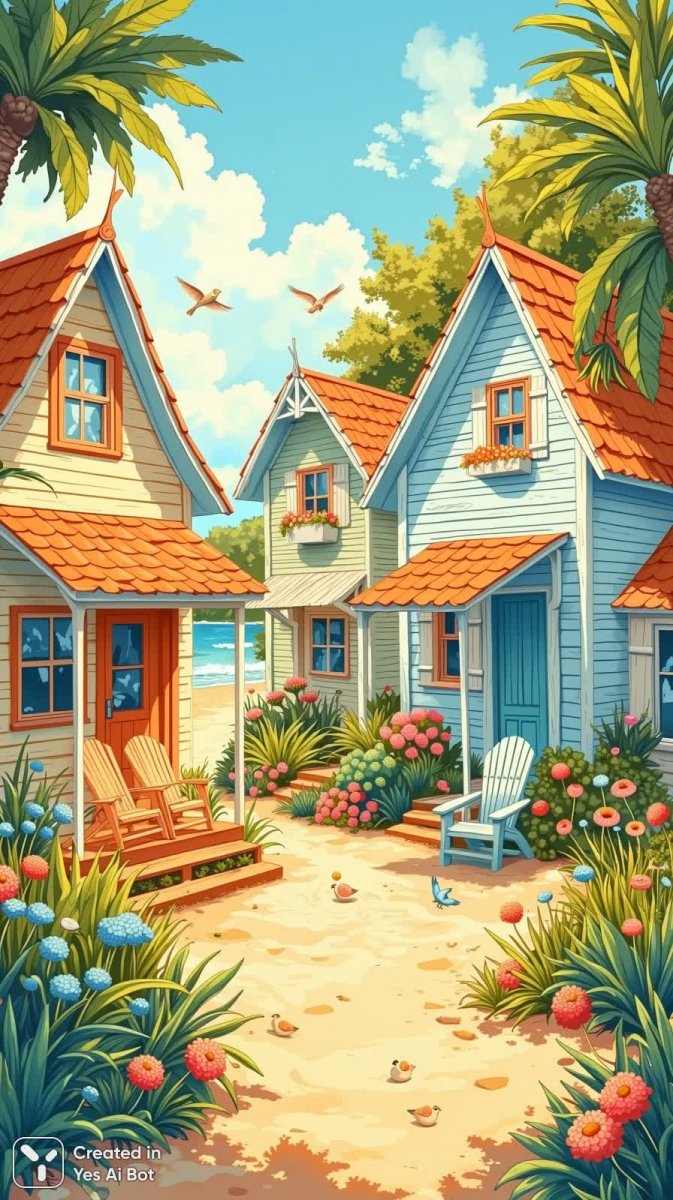 Идиллическая картина наивного искусства, мастерски изображающая очаровательные пляжные коттеджи с причудливым и сказочным дизайном. Каждое жилище выделяется своей уникальной архитектурой, украшенной яркими деталями и неординарными формами, создавая атмосферу беззаботной радости и волшебства. Тёплые лучи солнца ласково омывают постройки, заливая всё вокруг золотистым светом и подчеркивая живописность сцены. Вокруг коттеджей раскинулась пышная зелень – сочные травы, экзотические цветы и высокие деревья создают ощущение гармонии с природой и умиротворения. Весёлые птицы, порхающие в небе и сидящие на ветвях, добавляют динамики и лёгкости композиции, наполняя её звонкими трелями и оживлённым движением. Вся картина пронизана атмосферой тепла, уюта и безмятежности, приглашая зрителя окунуться в мир фантазии и насладиться красотой простого, но гениально воплощённого момента. Детализированная иллюстрация передаёт мельчайшие нюансы текстур и оттенков, создавая эффект реалистичности и погружая в атмосферу солнечного дня на живописном побережье. Это настоящее произведение искусства, которое дарит положительные эмоции и вдохновляет на новые свершения. Картина излучает оптимизм и радость жизни, заставляя верить в чудеса и красоту окружающего мира. Она словно приглашение к путешествию в сказочную страну, где царят гармония и счастье