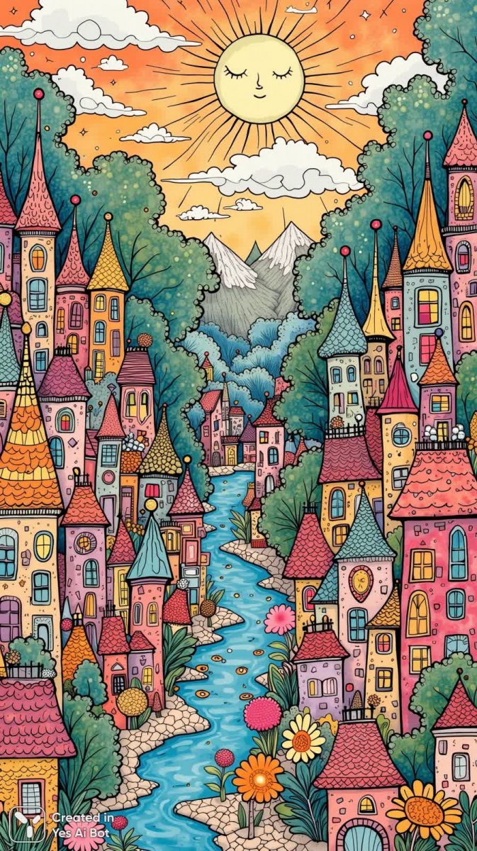 Зентангл: волшебный город мечты в ярких красках и мультяшном стиле - Генерация изображения с помощью нейросети Flux