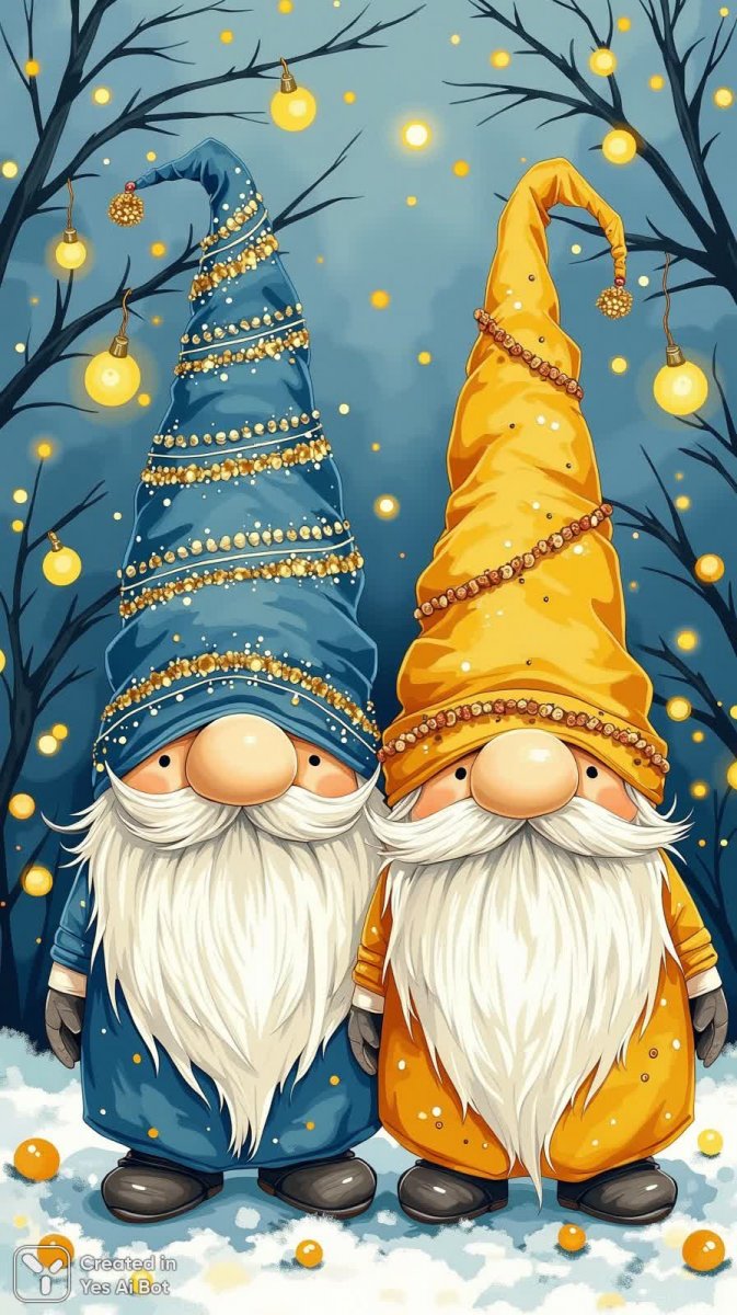 paper cut gouache illustration of two gnomes, one in vibrant blue and the other in cheerful yellow, standing side by side with white beards, each wearing festive hats embellished with sequins, against a backdrop filled with twinkling lights.