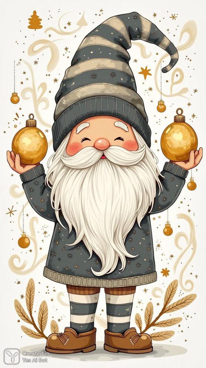 zentagle illustration of a gnome character with long white beard, dressed in a cozy gray sweater and striped socks, holding two shiny golden ornaments, surrounded by swirling holiday patterns.