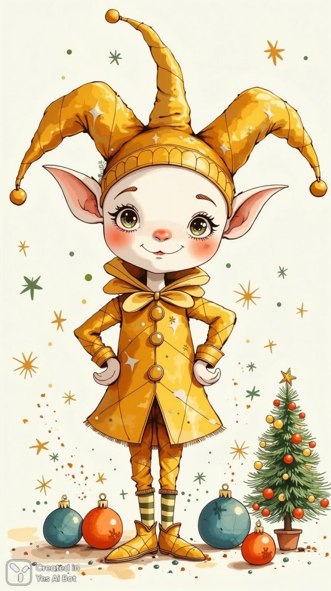 Игривый рождественский персонаж оживает на вашем экране! Этот очаровательный рисунок представляет собой шута, стилизованного под праздничный орнамент. Его золотой костюм сияет, а огромная двухконечная шляпа добавляет ему особого шарма и веселья. С гордо поднятой головой он словно зазывает нас в атмосферу волшебства и радости. Рядом с шутом расположилась крошечная елочка, украшенная яркими праздничными атрибутами, создавая ощущение настоящего рождественского чуда. Кажется, будто этот персонаж – воплощение беззаботного настроения и искренней любви к зимним праздникам. Его образ полон фантазии и легкости, даря тепло и позитивные эмоции каждому зрителю. Этот рисунок станет прекрасным украшением для вашего дома или отличным подарком близким людям, желающим окунуться в атмосферу сказки и волшебства. Яркие цвета и детализированная проработка делают этот персонаж поистине уникальным и запоминающимся символом Рождества. Он излучает неподдельную радость и создает ощущение праздничного настроения, которое невозможно не почувствовать
