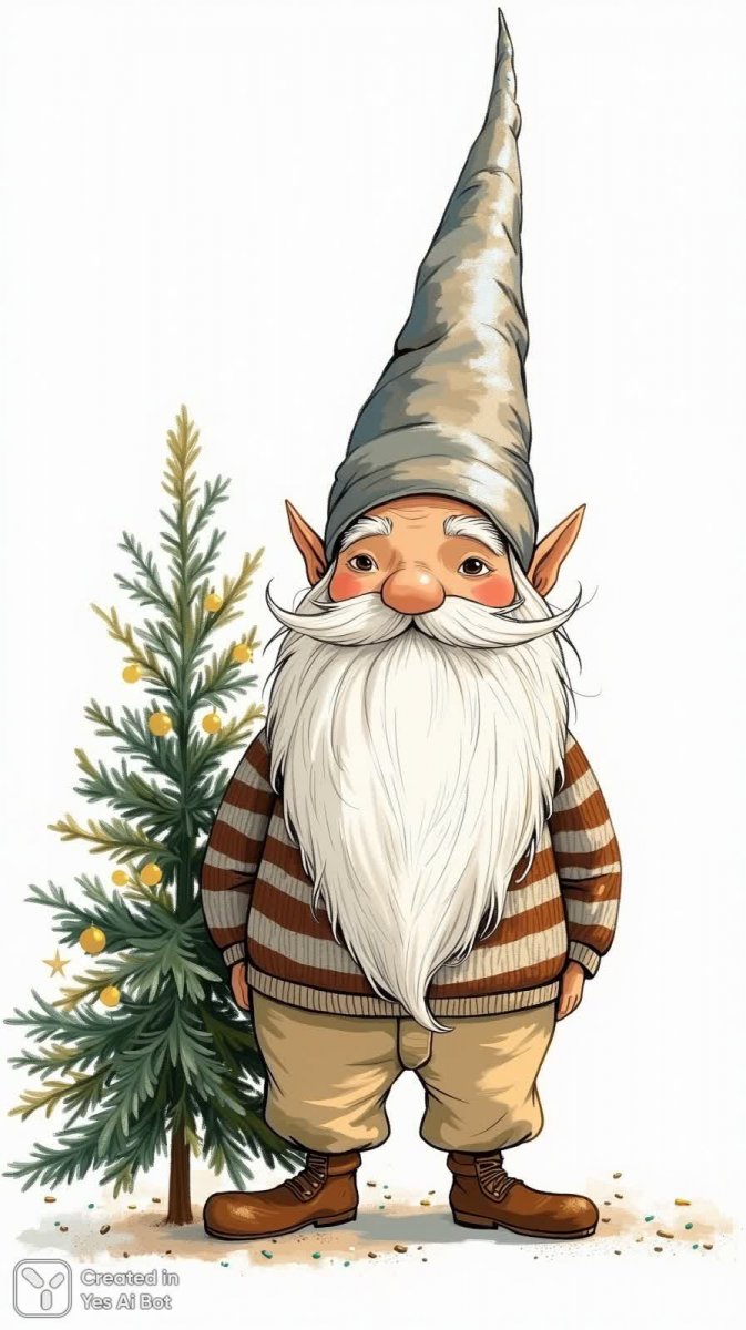 cartoonish sketch of a gnome with a long white beard and a metallic pointed hat, dressed in a striped sweater and beige pants, standing beside a small tree decorated with shiny ornaments in a festive atmosphere.