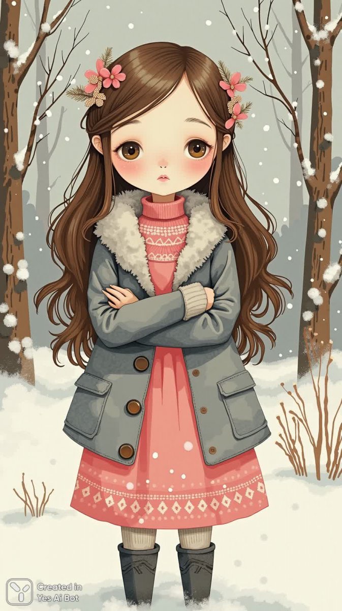 folk art depiction of a doll with long brunette hair wearing a fur-trimmed gray coat, pink dress with patterned sleeves, round face, accessorized with pink cheeks, standing with arms crossed in a cozy winter scene.