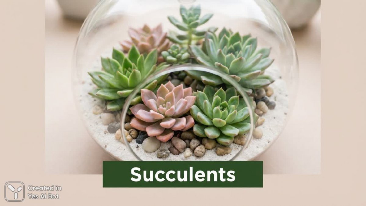 Text on dark green banner: "Succulents" against a soft beige background at the bottom of the image. A minimalist terrarium filled with various succulents, close-up shot, top angle, showcasing vibrant green and subtle pink hues of the plants nestled among fine white sand and small pebbles, gently illuminated by soft, diffused natural light creating a calming atmosphere, surrounded by a delicate glass dome that enhances the natural beauty of the flora. Captured with a Nikon D850, 35mm f/1.4 lens, achieving exquisite depth of field and sharp focus on the succulents, while a blurred background adds a serene touch. Photography style: elegant, tran...