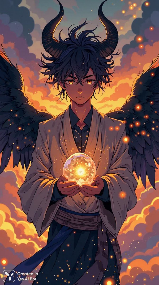 мгновение мистического: инкуб с черными крыльями, его лицо наполовину скрыто тенью, в глубине глаз мерцают светлячки, позади него ощущение заката, оранжевые и фиолетовые тона расползаются по небу, он держит в руках таинственную сферу, отражающую окрестности, а вокруг мерцают световые волны, размытость и гибкость придают снимку магический эффект.
