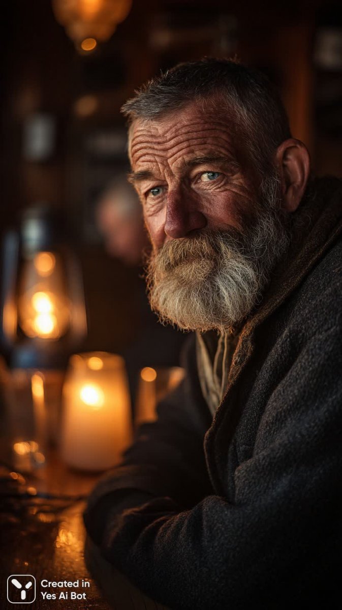 Лицо моряка, изрезанное временем и ветрами, словно старая карта со множеством пройденных маршрутов. В его глубоких глазах отражается безграничность океана и горечь утраченных надежд. Морщинистая кожа, выветренная солнцем и солью, хранит в себе истории бесчисленных штормов и тихих рассветов на борту корабля. Старый шерстяной жакет, повидавший немало бурь, облегает его плечи, словно надежный щит от холода и невзгод. Мягкий свет свечи едва касается его лица, подчеркивая тонкие линии печали и мудрости, накопленной за долгие годы плавания. Дымка табачного дыма клубится в полумраке старого портового трактира, где деревянные балки и грубые кожаные текстуры создают атмосферу уюта и забытых историй. Тепло рассеянного света от керосиновой лампы ласкает его лицо мягким боковым светом, добавляя глубины и драматизма образу. Кажется, будто он замер в моменте воспоминания, погруженный в размышления о минувших днях и далеких берегах. В этом портрет не просто старого моряка, это воплощение мудрости, стойкости и тихой грусти человека, посвятившего свою жизнь бескрайним водам океана. Каждый шрам на его лице – это напоминание о пережитых испытаниях, а в каждом взгляде – отблеск бесконечных горизонтов и неизведанных тайн морской стихии. Он - живая легенда, чья душа навечно связана с морем