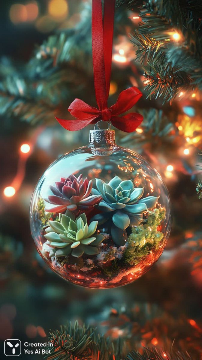 hyper realistic, photorealistic a glass ornament filled with various succulent plants and cacti, decorated with a shiny red bow, dangling from a beautifully adorned christmas tree, blurred holiday lights in the background