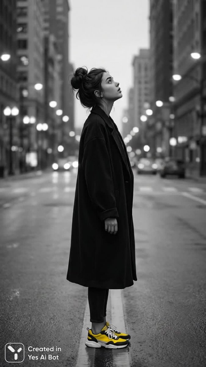 monochrome, bw digital art, bright yellow accent on sneakers, minimalistic, young woman standing in empty street wearing oversized black coat, hair in messy bun, looking up with a sense of wonder, BG is blurred buildings and street lights.