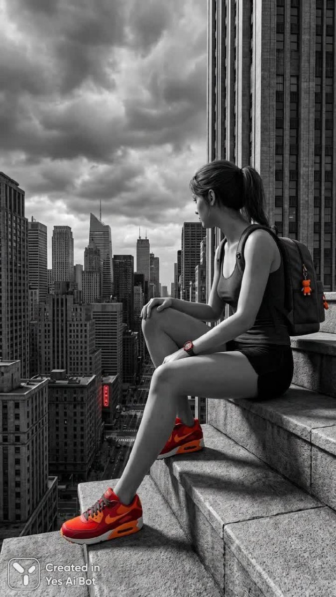 monochrome, bw digital art, bright yellow accent on sneakers, minimalistic, young woman sitting on steps of tall building, wearing striped tank top and black shorts, gazing contemplatively into the distance, BG is cityscape with skyscrapers and cloudy sky.