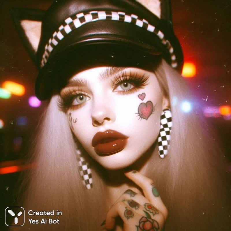 фото на плёнку, вид через плёнку, живая фотография с эффектом Polaroid, ночь не в фокусе, дома, живая очень, очень красивой пушистой девушка кошка блонд хулиганка, кепка кошка, цветное тату на лице, бордовые губы, бледная влажная кожа, большие серые глаза, длинные убраны волосы, чёкер клёпки, большие длинные серёжки, тату, кислотно неоновые оттенки одеяние, поза в движение, минимализм, fantasy, кислотно яркие оттенки, сепия, игра теней, дымно, просроченный снимок на пленку, фотовспышка