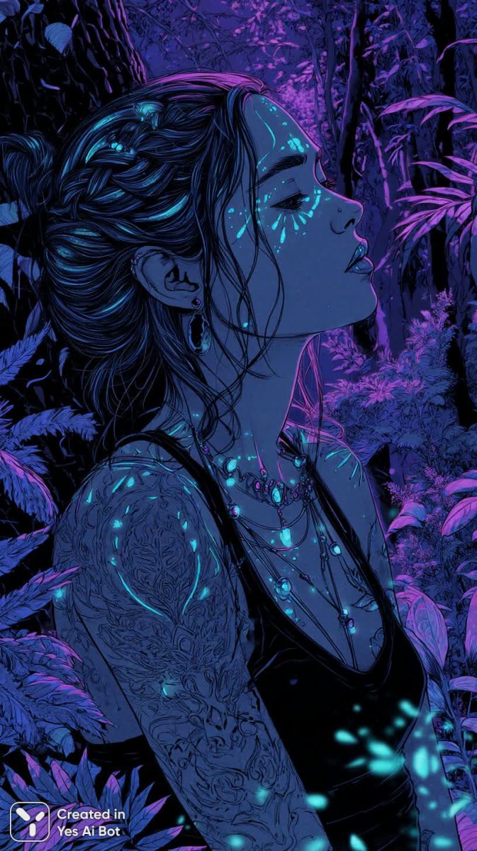 Загадочная готика в неоновом свете. Изысканный рисунок тушью изображает девушку в готическом стиле с ярким драматичным макияжем и татуировками из серебра, словно сотканными из жидкого металла. Ее украшают сверкающие неоновые аксессуары, а длинные струящиеся волосы добавляют образу неземной шарма. Она стоит в мистическом лесу, окутанном ультрафиолетовым сиянием, создавая атмосферу таинственности и волшебства. Черный фон усиливает контраст ярких неоновых цветов, подчеркивая ее притягательность и загадочность. Эта иллюстрация – воплощение современной готики с элементами фантазии и футуризма, где переплетаются красота, сила и потусторонний мир. Девушка словно явилась из другого измерения, чтобы покорить зрителя своей необычной внешностью и завораживающей аурой. Изображение излучает энергию и притягательность, заставляя задуматься о скрытых смыслах и тайнах, которые оно хранит. Это не просто портрет, а целая история, рассказанная с помощью ярких красок и тонких линий