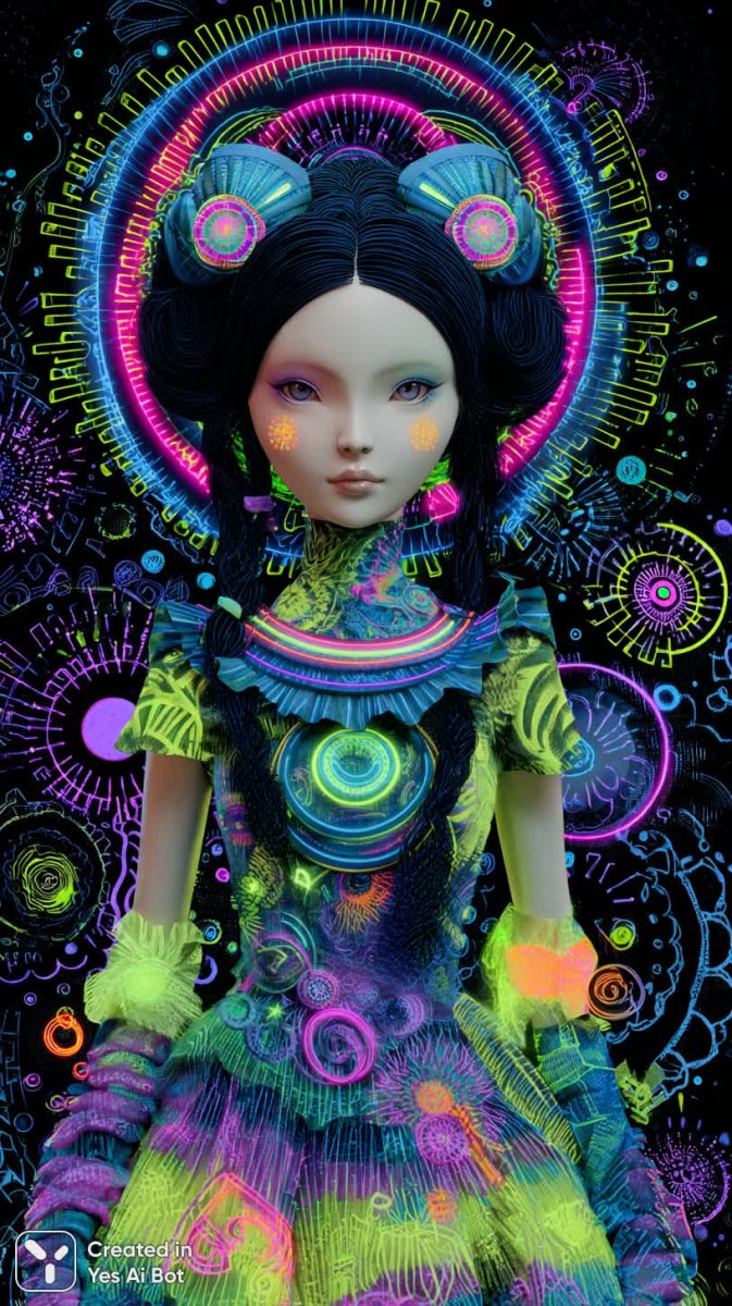 midjourney Неоновая абстракция: бжд кукла в мире ярких красок и текстур. Изображение из нейронной сети Миджорни