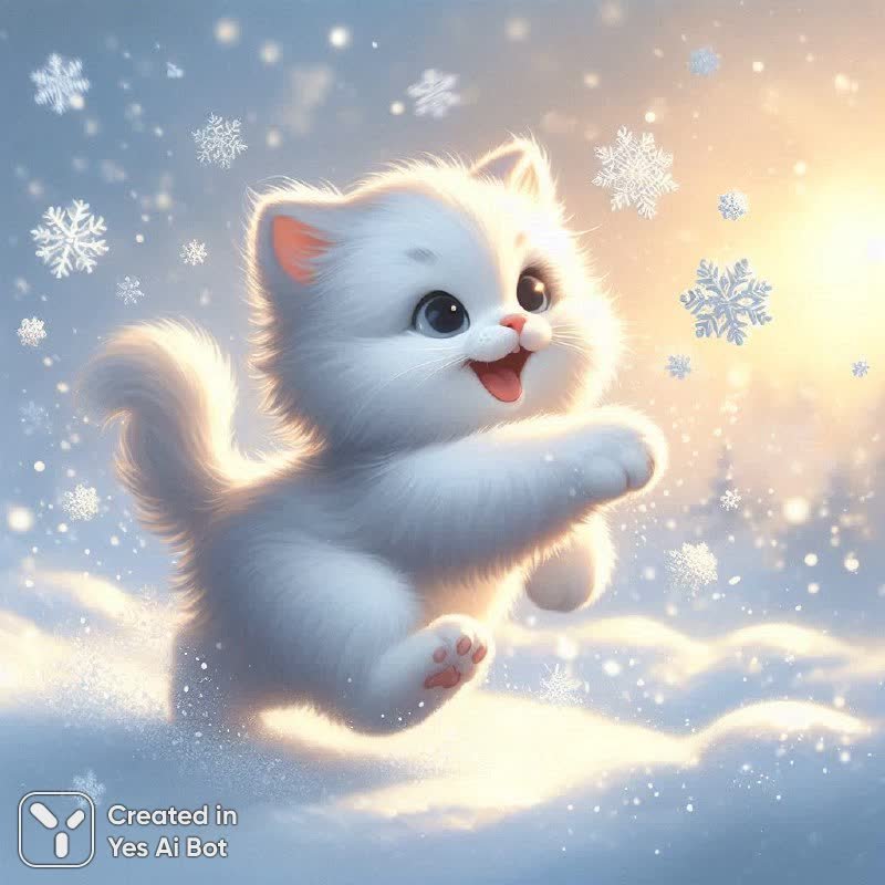 Игривый зимний этюд с очаровательным котенком, наполненный светом и радостью. Белый пушистый малыш мчится по искрящемуся снегу, словно воплощение новогоднего чуда. Его крошечные лапки легко подхватывают снежинки, отправляя их в забавный полет. На мордочке котенка играет счастливая улыбка, отражающая восторг от зимней прогулки. Мягкий утренний свет окутывает сцену, создавая атмосферу тепла и уюта. Кажется, что время останавливается, позволяя насладиться этой мимолетной картиной радости и беззаботности. Невероятное сочетание белого цвета снега и котенка, подчеркнутое нежным светом, создает ощущение сказки и волшебства. Этот образ наполнен детской непосредственностью и искренней любовью к зиме, пробуждая самые светлые чувства и даря заряд позитивной энергии. Наблюдать за этой забавной сценой – одно удовольствие, словно прикоснуться к частичке зимнего волшебства. Кажется, что котенок приглашает нас присоединиться к его веселью, окунуться в мир радости и беззаботности, где каждый момент наполнен счастьем. Это прекрасное изображение для тех, кто любит зиму, кошек и просто хочет добавить немного света в свою жизнь
