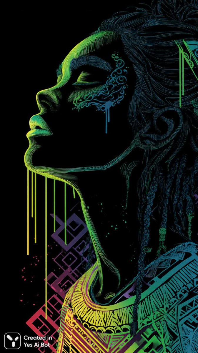 Завораживающая иллюстрация в технике тушевой графики представляет собой образ девушки, окутанной мистическим свечением. Ее контуры мягко светятся, а руки украшены яркими неоновыми татуировками, словно ожившими произведениями современного искусства. Особое внимание привлекают ее губы – насыщенные, пульсирующие неоновым сиянием, видимым даже для человека с дефектом цветовосприятия. Фантастические тени, подсвеченные флуоресцентным светом, создают ощущение глубины и объема, а капли стекающей неоновой краски добавляют динамики и хаотичной красоты. Девушка в стильном наряде с неоновыми аксессуарами выглядит как воплощение бунтарского духа, идеально сочетаясь с геометрическим узором фона. Черный фон подчеркивает яркость и контрастность неоновых цветов, создавая эффект погружения в альтернативную реальность. Эта работа – настоящий гимн современному искусству, объединяющий в себе элементы графики, живописи и дизайна. Она призвана удивлять, вдохновлять и заставлять задуматься о границах восприятия и красоте, которая существует вне общепринятых рамок. Иллюстрация передает ощущение энергии, молодости и готовности к переменам, словно приглашая зрителя в мир ярких красок и безграничной фантазии. Композиция отличается гармоничностью и сбалансированностью, что делает ее визуально привлекательной и запоминающейся