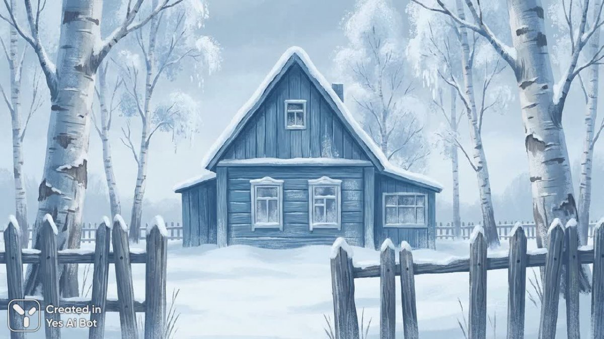 A snow-covered blue wooden house is the central element of this winter landscape. The house has a steep roof decorated with snow and is framed by bare birch trees covered with frost. A rustic wooden fence with pointed posts, partially covered with snow, stretches across the foreground. The house has wooden window frames and contrasting blue trim. The surroundings are covered with snow, creating an atmosphere of calm and cold. The lighting is soft and diffused, emphasizing the texture of the wood and snow. The composition uses a medium shot, with the house centered, creating a sense of tranquility and the stark beauty of a winter landscape. Th...