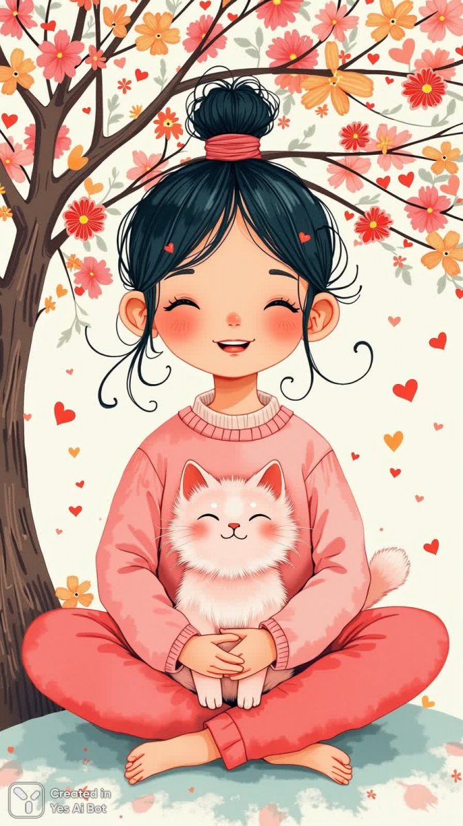 naive art, ink drawing of a cute girl in a pink sweater with a fluffy pink cat on her lap, smiling joyfully, a whimsical tree in the background with colorful blossoms and floating hearts, flat illustration style, gentle and bright tones.