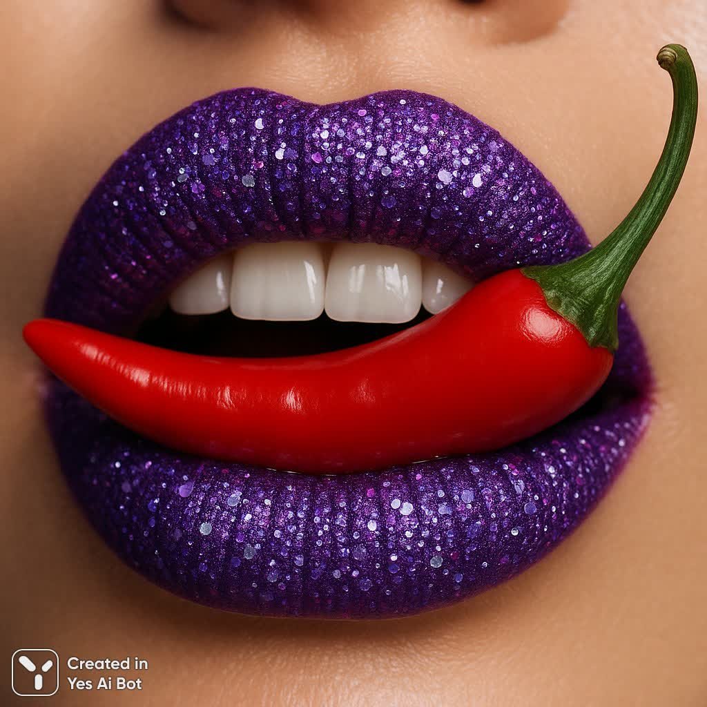 hyper realistic, photorealistic, a close-up of woman's mouth with metallic purple lips covered in shimmering crystals, with a bright red chili pepper nestled within, teeth displayed and striking, background resulting in a gentle blur to enhance focus.