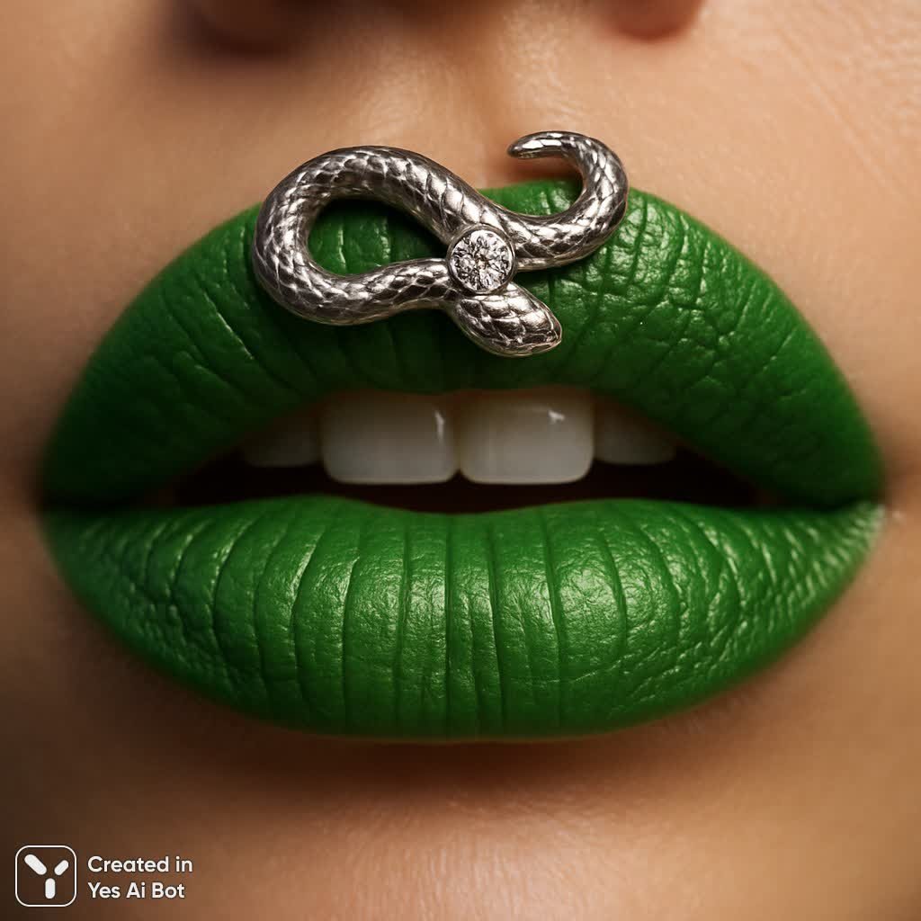Невероятно детализированный портрет, демонстрирующий завораживающую красоту и дерзкий стиль. В центре внимания — крупный план чувственных женских губ, окрашенных в яркий, насыщенный зеленый цвет, который контрастирует с бледной кожей и создает эффектную визуальную доминанту. Серебряная змея грациозно обвивается вокруг верхней губы, добавляя образу загадочности и символизма, намекая на мудрость, трансформацию и скрытую силу. В самом сердце этого изысканного украшения мерцает крошечный бриллиант, который отражает свет и привлекает внимание к центру губ, подчеркивая их форму и текстуру. Зубы едва заметны в этом художественном изображении, добавляя реалистичности и натуральности. Фон плавно переходит в приглушенный градиент, создавая мягкое и рассеянное освещение, которое акцентирует внимание на деталях лица и подчеркивает глубину и объем изображения. Фотореалистичность картины поражает своей точностью и детализацией, позволяя зрителю ощутить текстуру кожи, гладкость губной помады и блеск драгоценного камня. Это произведение искусства является настоящим триумфом гиперреализма, сочетающим в себе красоту, символизм и техническое мастерство, создавая незабываемое впечатление. Изображение излучает уверенность, соблазн и неповторимый стиль, воплощая собой современную интерпретацию классической женской красоты