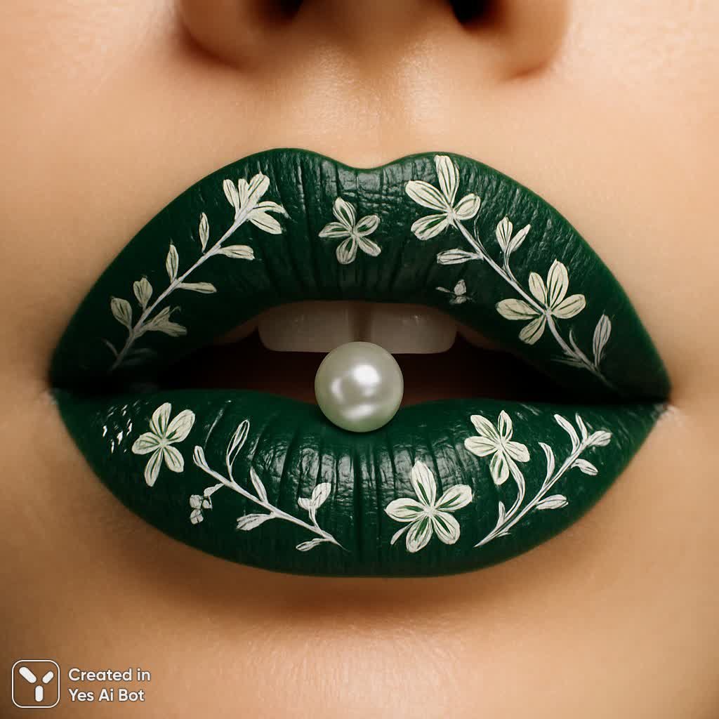 Невероятно реалистичный крупный план женского рта завораживает своей изысканной красотой. Губы слегка приоткрыты, словно приглашая к тайне и соблазну. Поверхность губ украшена глубоким лесным зеленым цветом, который создает эффект бархатистости и загадочности. Деликатные белые цветочные узоры добавляют нежности и легкости этому драматичному образу. В центре губ, словно драгоценный дар, покоится крошечная жемчужина – символ элегантности и безупречного вкуса. Теплый бежевый фон создает контраст с насыщенными темными оттенками губ, подчеркивая их выразительность и объем. Эта фотография демонстрирует мастерство фотографа в передаче мельчайших деталей и текстур, создавая иллюзию присутствия и позволяя зрителю ощутить нежность прикосновения к этим безупречным губам. Идеальное сочетание цветов и композиции делает этот образ поистине незабываемым произведением искусства, достойным восхищения и вдохновения. Это не просто фотография – это запечатленный момент красоты и грации, способный покорить любого зрителя своей реалистичностью и эстетической привлекательностью