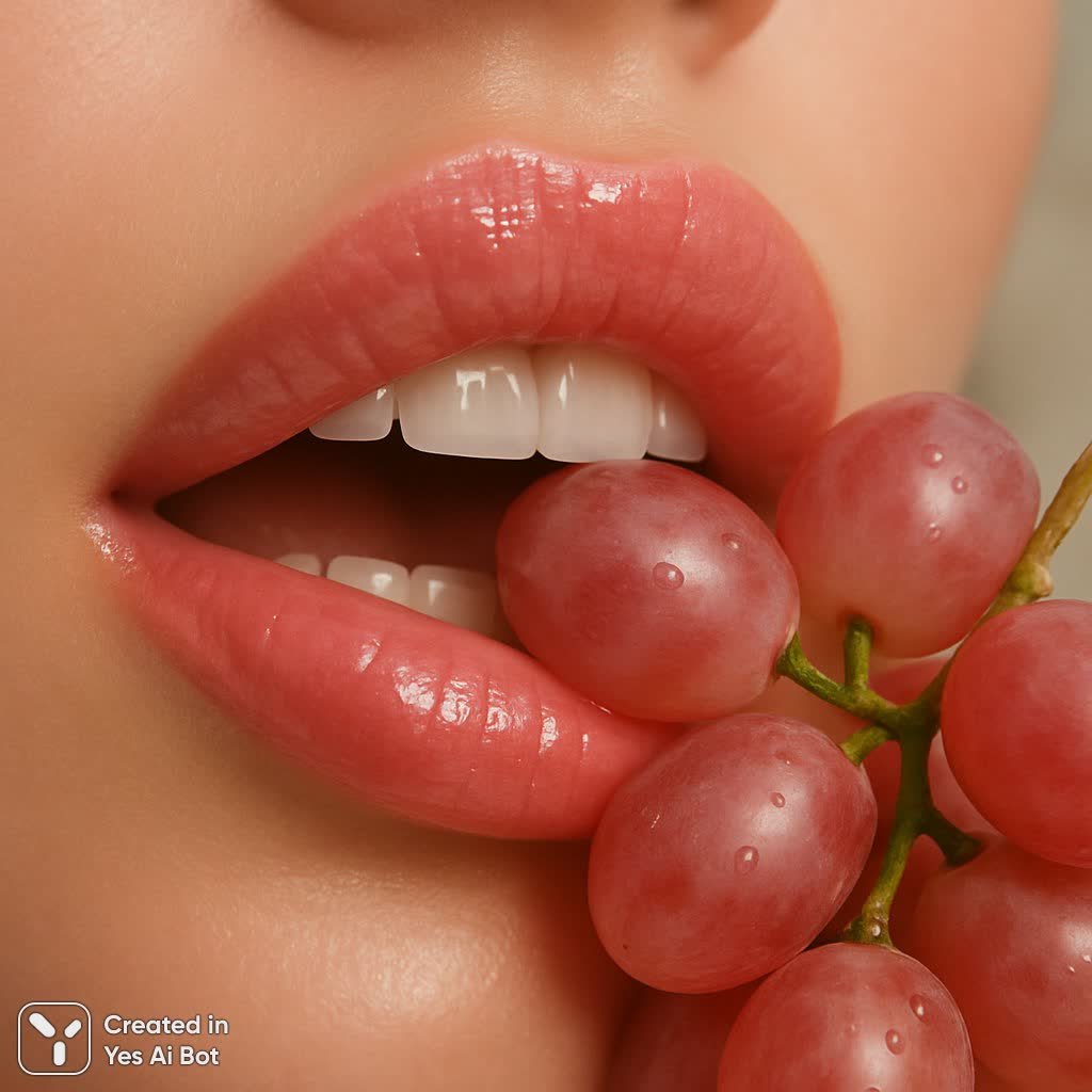 hyper realistic, photorealistic, a close-up of a mouth adorned with a delicate pink gloss. the woman's teeth are partially visible as she playfully bites into a bunch of glistening pink grapes, against a gentle blur that complements the freshness of the scene.