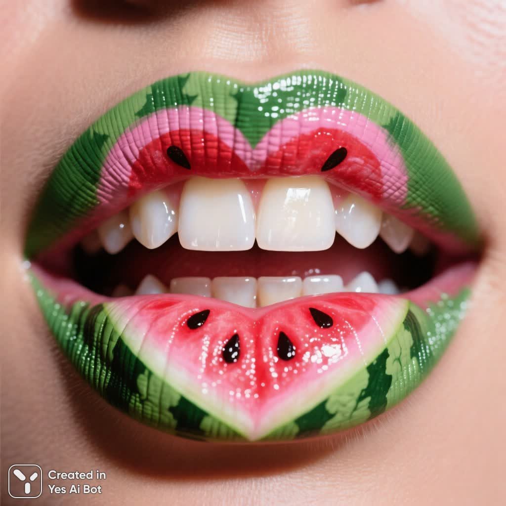 hyper realistic, photorealistic, a close-up woman’s mouth, teeth visible. lips painted watermelon design with pink and red colors forming heart shape. green lipstick adding texture.