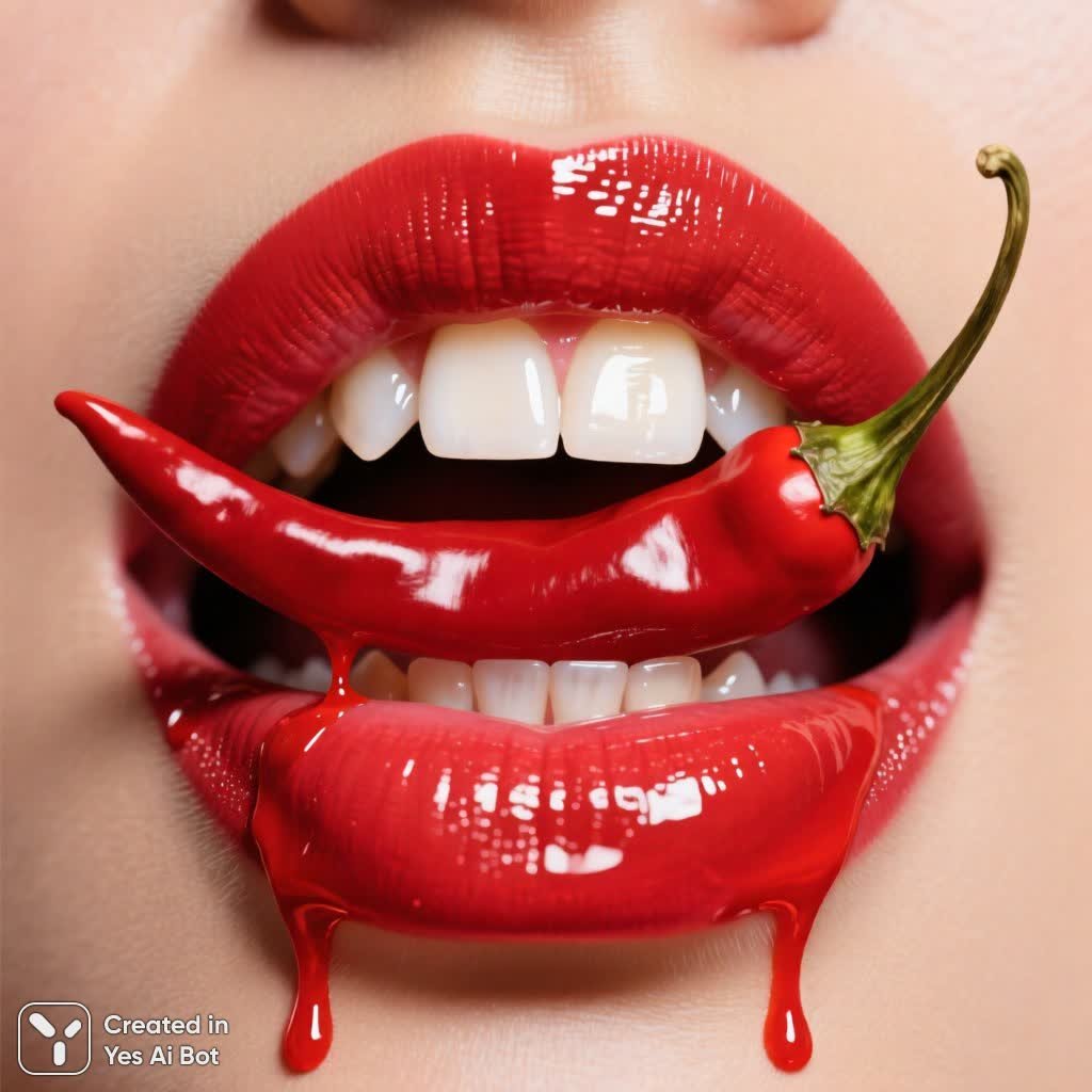 Изысканная провокация в деталях: макроснимок раскрывает чувственную двойственность. Губы, словно лепестки экзотического цветка, окрашены в огненно-красный оттенок помады, стекающей соблазнительными каплями по краям. Этот яркий акцент контрастирует с нежной бледностью фона цвета слоновой кости, создавая эффект драматической глубины и подчеркивая визуальное напряжение. В центре внимания – зубы, идеально белые и ровные, добавляющие реализма и анатомической точности композиции. Неожиданный акцент в виде перчика чили, выглядывающего из-под губ, привносит элемент игривости и намекает на скрытую страсть, смешивая красоту с легкой долей опасности. Каждая деталь проработана с невероятной тщательностью, передавая текстуру кожи, блеск помады и шероховатость перца в мельчайших нюансах. Этот снимок – не просто изображение, а захватывающее дух погружение в мир чувственности, соблазна и визуального наслаждения, выполненное с фотографической точностью и гиперреалистичной детализацией, поражающей воображение своей реалистичностью и эстетической привлекательностью. Это визуальный гимн красоте, смелости и непредсказуемости, воплощенный в ярких красках и безупречной технике исполнения