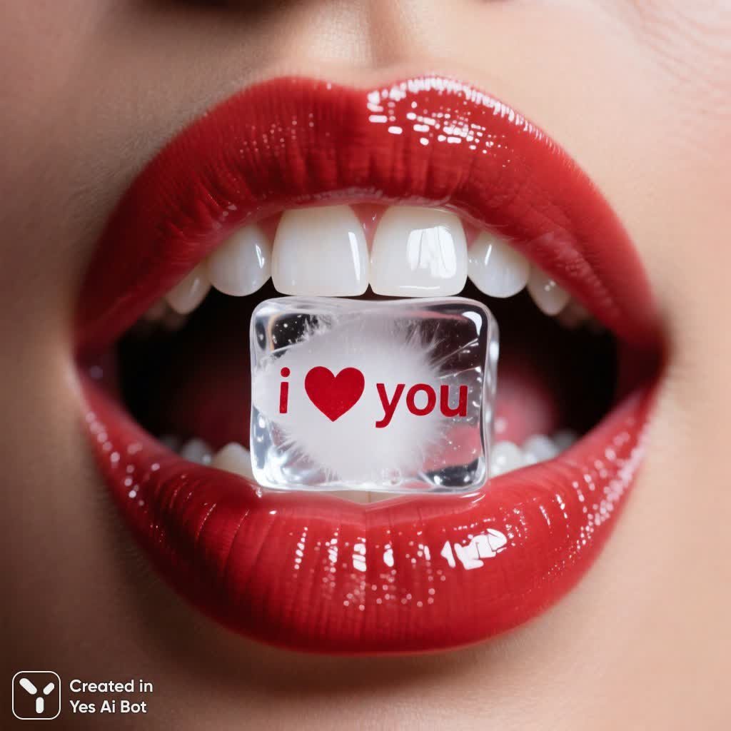 hyper realistic, photorealistic, a close-up woman's mouth with red lips. the lips slightly parted, showcasing gleaming white teeth. a clear ice cube sits between her teeth, featuring text "i ❤️ you" enclosed within it, creating a captivating focal point. the background is a muted color, highlighting the vibrant details of the mouth.
