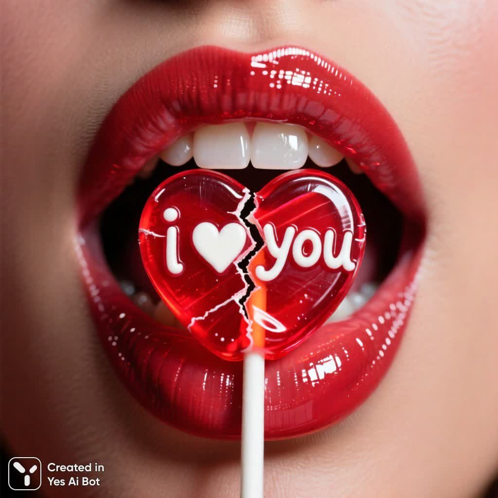 hyper realistic, photorealistic, a close-up of a woman's mouth, showing shiny red lips and a whimsical lollipop shaped like a broken heart resting between her teeth, "i ❤️ you" inscribed in playful lettering on the lollipop, the background softly fading to accentuate the details.