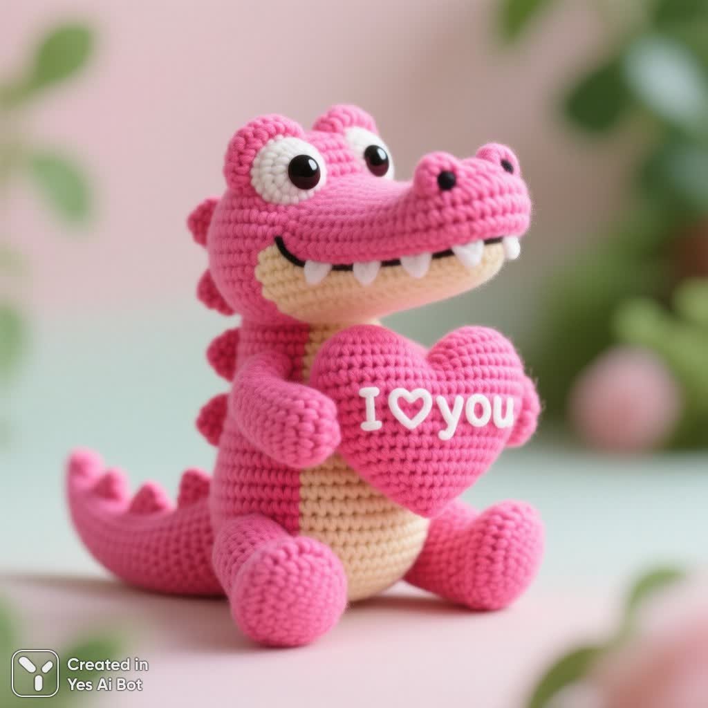 crocheted crocodile toy in bright pink, holding a matching pink heart, text on heart: "I ❤️ you", round eyes with playful expression, set against a soft pastel background with hints of greenery.