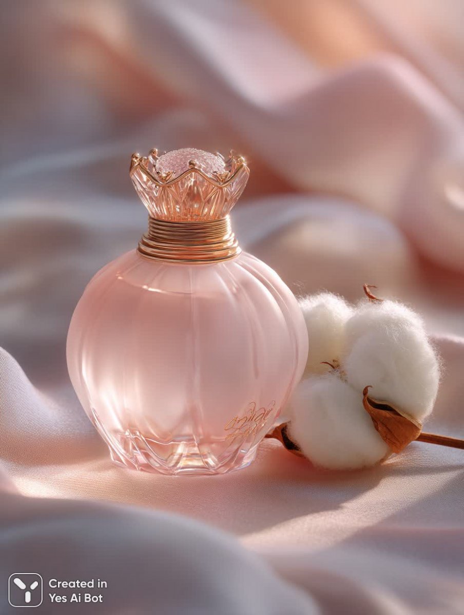 Флакон стоит на фоне струящейся пастельно нежно-розовой шёлковой ткани, уложенной мягкими волнами. Рядом лежит фигурный зефир нежной формы, бело-розовый, усыпанный тонкими крупинками сусального золота. Рядом с композицией элегантно положена веточка натурального хлопка с раскрытой коробочкой, подчёркивающая воздушну...