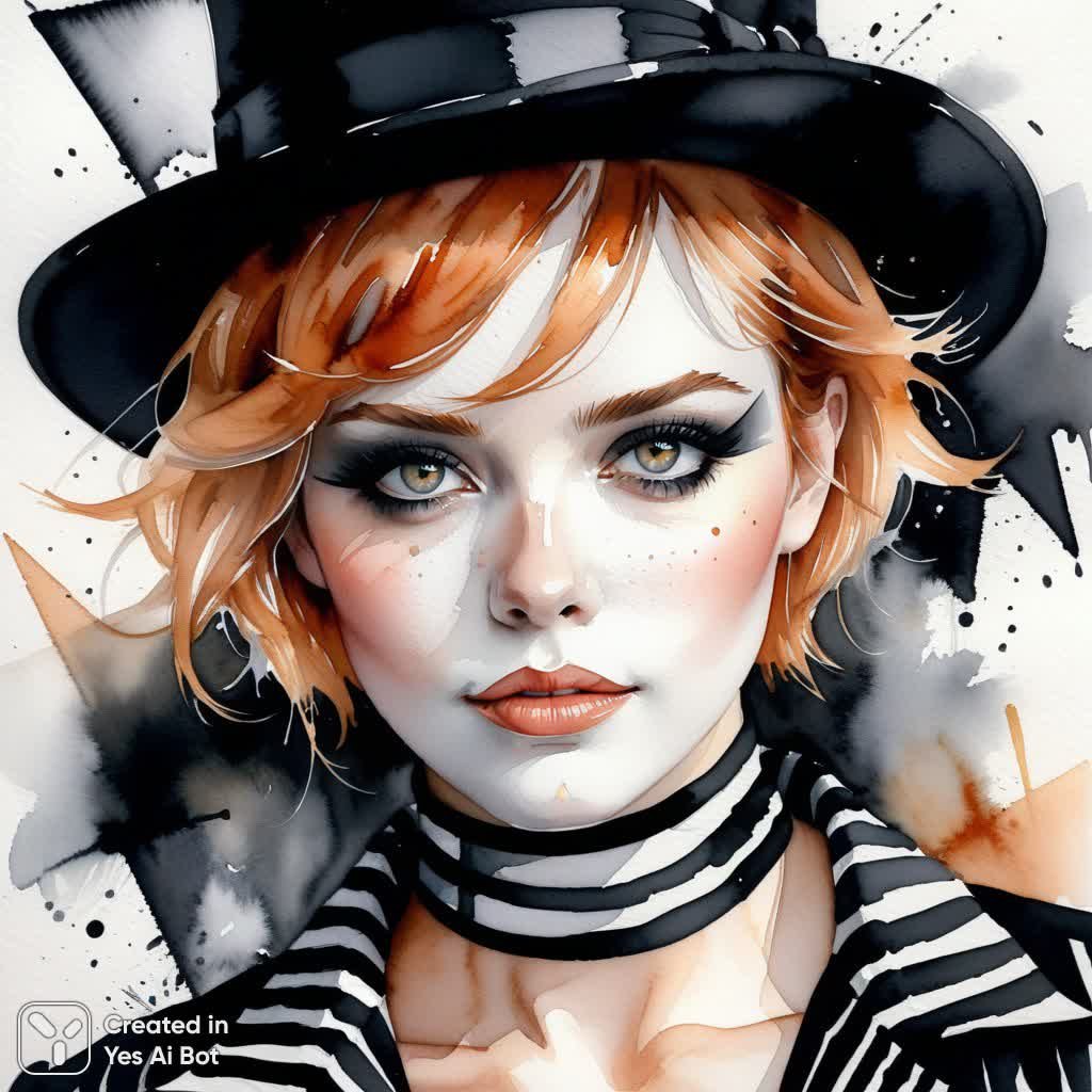 watercolor acrylic random pose is a young white woman with light copper tousled short hair with a pale, white-painted face decorated with a black tear and dark triangular eyes. He is wearing a black top hat and a black-and-white striped shirt. a face with a neutral expression, emphasizing the spectacular makeup. The background is black, which allows you to focus on the person's face.