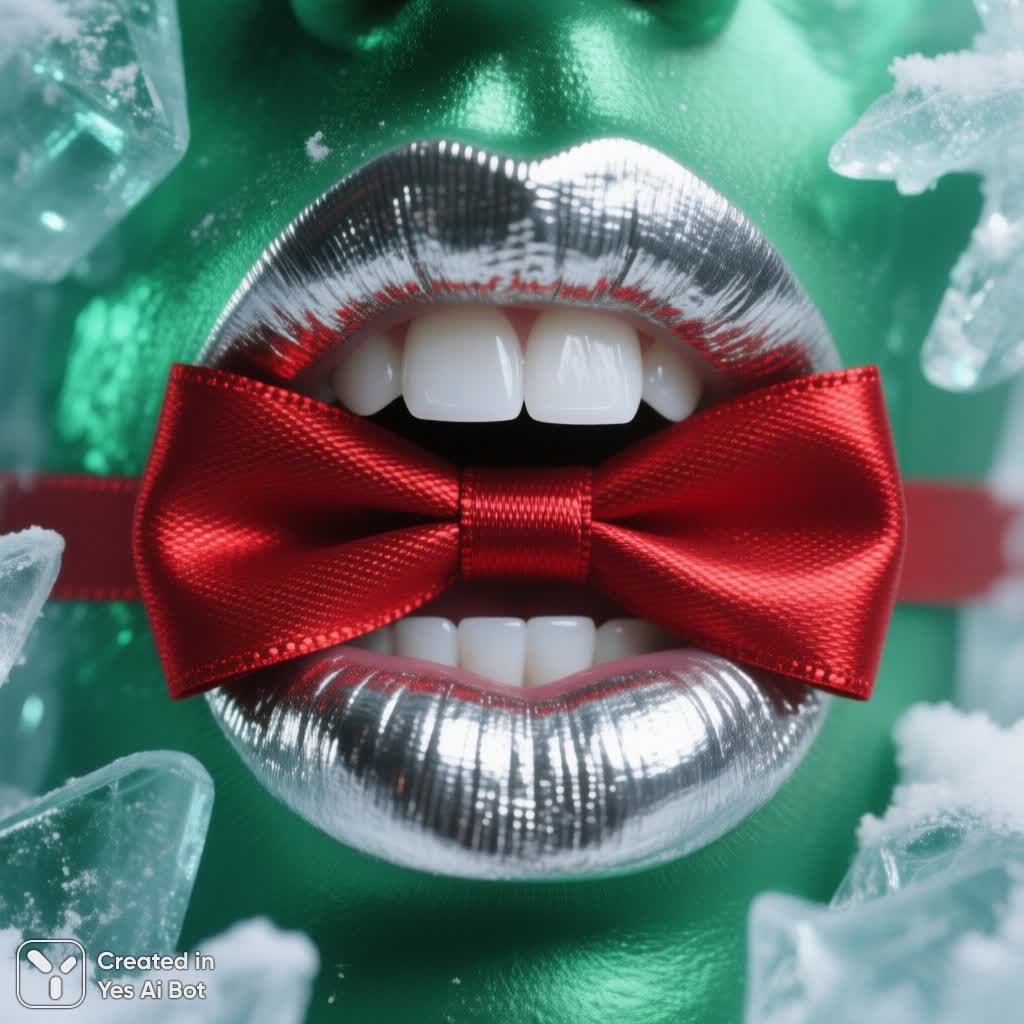 hyper realistic, photorealistic, a close-up of metallic silver lips, slightly parted, revealing white teeth, with a shiny red bow tucked in between, and green icy textures surrounding the image to convey a winter celebration.