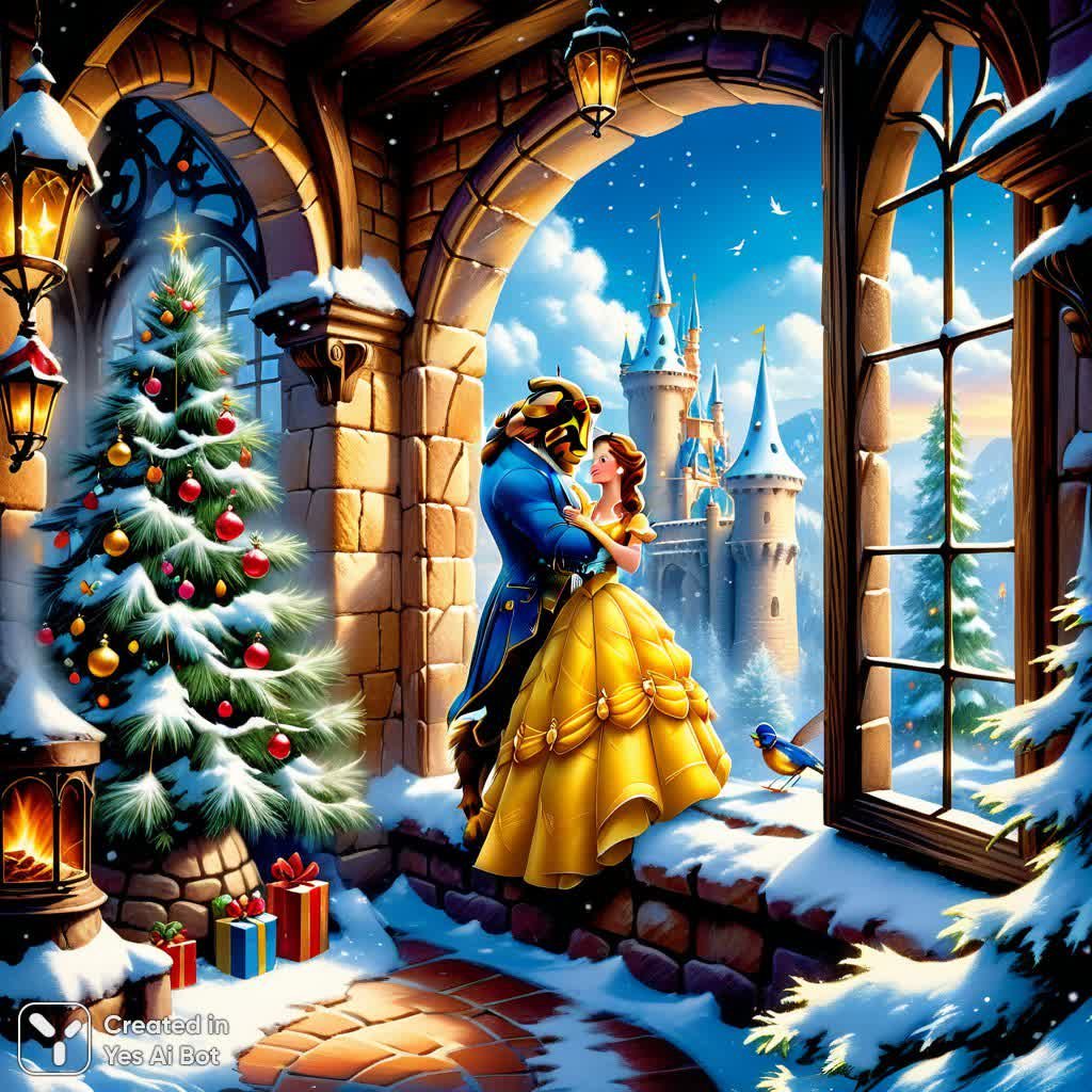 Disney, улыбающиеся красавица и чудовище, танцы в замке, рождественская елка, камин, птицы сидят на сосновой ветке, за окном. Снег, мороз, иллюстрации, фэнтези, сказки, пушистые узоры.