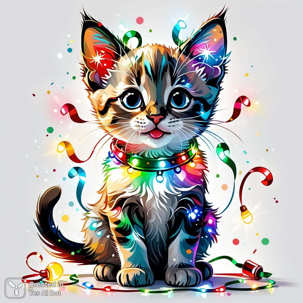 fluid art, splashes, surrealism, children's doodles, crazy, fantasy, chibi, a happy siamese kitten wearing christmas lights, against a white background, full body portrait, highly detailed, high definition, colorful color palette, high resolution
