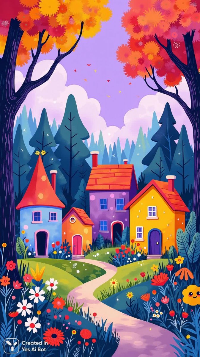 flux Сказочный лес и яркие домики в наивном стиле. Картинка из нейросети Flux.1